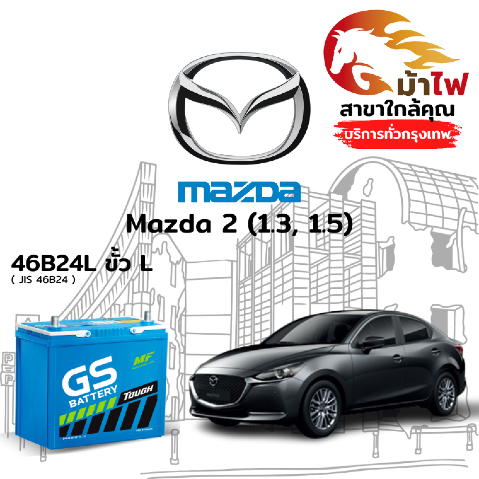Mazda 2 1.3 และ 1.5 ปี 2009-2014 มาพร้อมกับแบตเตอรี่ที่ต้องดูแลน้ำกลั่น รหัส B24 ขนาด 45 แอมป์ กำลังสตาร์ทประมาณ 350 CCA ขนาดเครื่องยนต์ 1.5 และอายุของรถแล้วที่แลดูมีอายุเยอะพอสมควร อาจทำให้ระบบการทำงานของไดร์ รวมไปถึงระบบไฟ สายไฟต่างๆ ทำงานได้ไม่เต็มร้อยเหมือนรถยนต์รุ่นใหม่ๆ ทางร้านแนะนำแบตเตอรี่สำหรับลูกค้า ควรเลือกใช้แบตเตอรี่ที่มีกำลังแอมป์สูงกว่า 45 แอมป์ อย่างเช่น *GS MFX60L (55B24) จุดเด่นของแบตเตอรี่รุ่นนี้ก็คือ มีขนาด 50 แอมป์ และกำลังสตาร์ท CCA สูง