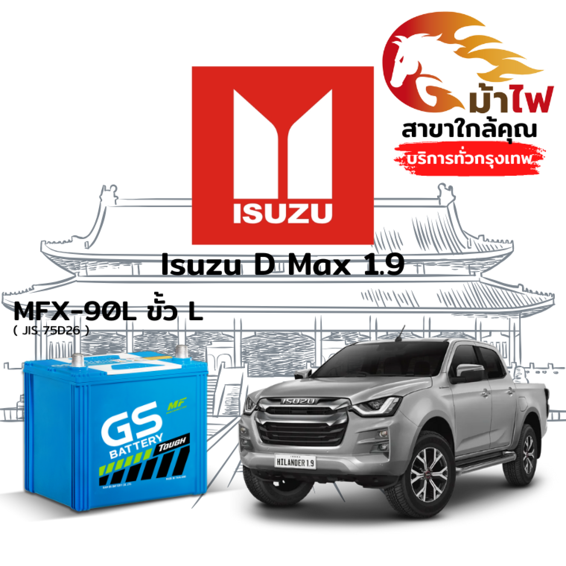 D-Max 1.9 (ปี 2013 - 2019) เปิดตัวรุ่นปรับโฉม 2015 พร้อมเปลี่ยนเครื่องยนต์ใหม่ 1.9 Ddi Blue Power รหัส RZ4E-TC ให้กำลังสูงสุด 150 แรงม้า ที่ 3,600 รอบ/นาที แรงบิดสูงสุด 350 นิวตันเมตร ที่ 1,800-2,600 รอบ/นาที เกียร์ธรรมดา 6 สปีด พร้อม Genius Sport Shift และเกียร์อัตโนมัติ 6 สปีด พร้อมโหมดการขับขี่แบบสปอร์ต Rev Tronic และรุ่น เกียร์ออร์โต้ X-Series 1.9 Ddi Blue Power ISUZU D-MAX 1.9 มาตรฐานแบตเตอรี่ติดรถยนต์ชนิดกึ่งแห้ง MF (Maintenance Free) รุ่น 75D26L (ขั่วซ้าย) จำนวน 65 แอมป์ กำลังสตาร์ทประมาณ 520 CCA ซึ่งแบตเตอรี่ที่เหมาะสมกับ ISUZU D-MAX 1.9 ทางร้านขอแนะนำใหัอัพเกรดแอมป์ให้สูงขึ้นจากเดิม *GS MFX90L (85D26) ขนาด 80 แอมป์ จุดเด่นของแบตเตอรี่รุ่นนี้ก็คือ มีขนาดแอมป์ และ กำลังสตาร์ทสูงสุดในกลุ่มแบตเตอรี่นี้ และเป็นแบตเตอรี่ MF ที่ไม่ต้องดูแลน้ำกลั่น ด้วยราคาสบายกระเป๋า และขนาดแอมป์ถึง 80 แอมป์ทางร้านเห็นว่าคุ้มค่าที่จะเปลี่ยนแบตเตอรี่รุ่นนี้ครับ