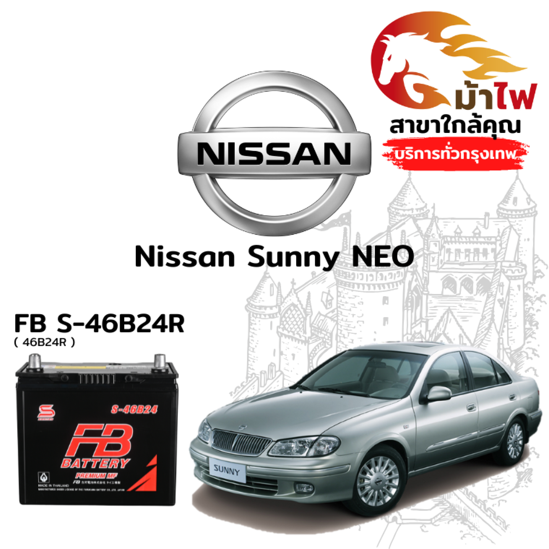 ปกติ แบตเตอรี่ Nissan Sunny Neo ที่ติดรถมาจะเป็นรุ่น 46B24ขั้วซ้าย จำนวนแอมป์ มาตรฐานคือ 45 แอมป์ ค่าCCA คือ 295 โดยแบตเตอรี่ที่ติดรถมาจะเป็นแบบ MF คือแบตเตอรี่กึ่งแห้งทั้งหมด ทำให้ไม่ต้องดูแลน้ำกลั่นเท่าไรนัก แบตเตอรี่ Nissan Sunny Neo นั้น ทางร้าน ม้าไฟ ได้พบว่า อายุการใช้งานโดยเฉลี่ยแล้วประมาณ เกือบ2ปี ไดชาร์จเดินไฟค่อนข้างนิ่ง